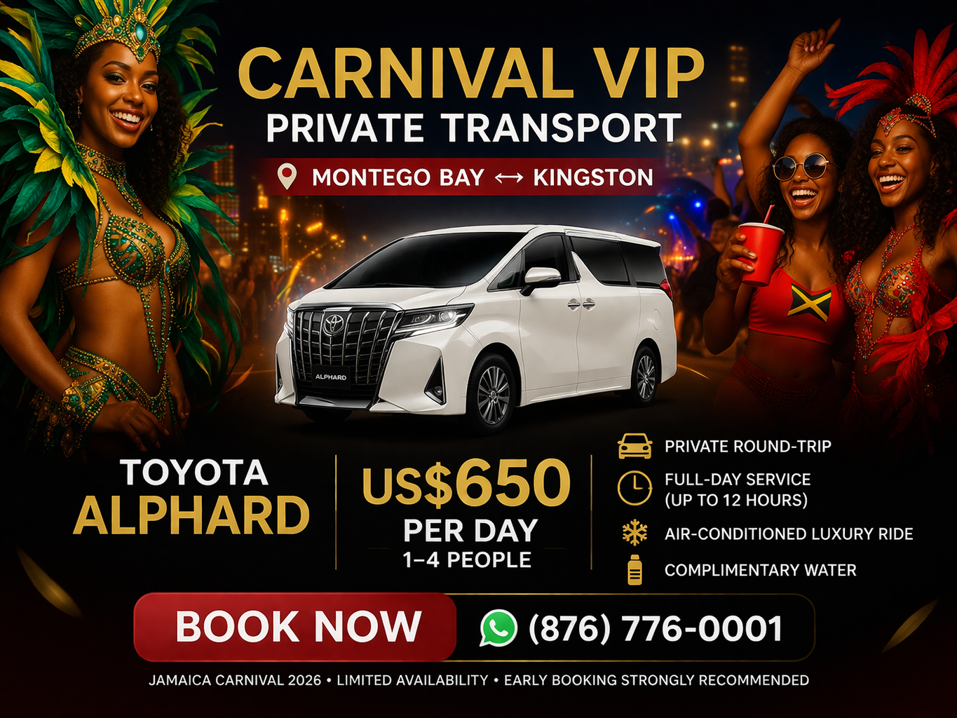Experience the energy of Jamaica Carnival in comfort, style, and total control for a full day.  Jamaica Carnival transforms Kingston into the ultimate party destination every April, attracting visitors from around the globe for a series of fetes, road marches, and partying